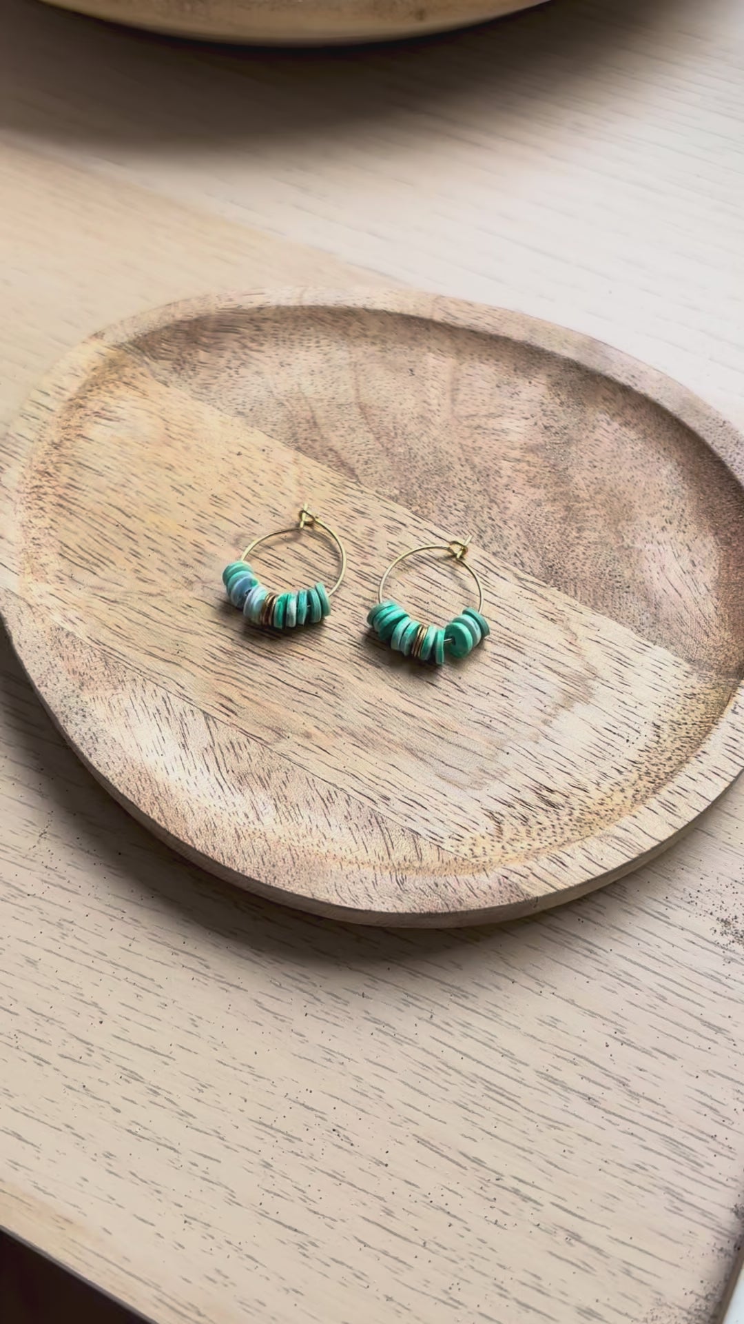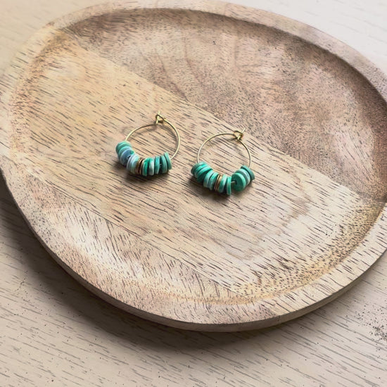 Les perles d'inspiration heishi qui ornent la créole sont réalisées à la main en argile polymère.