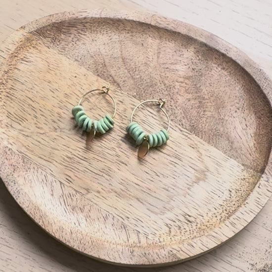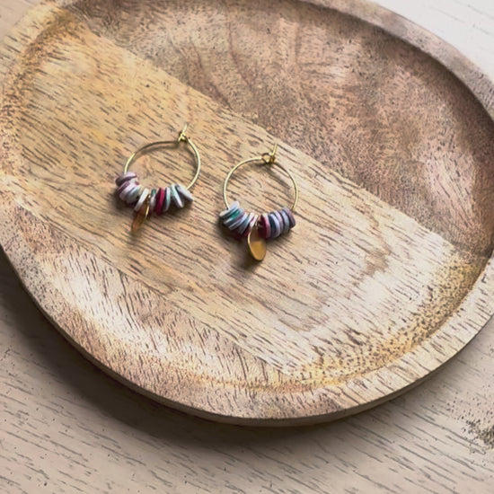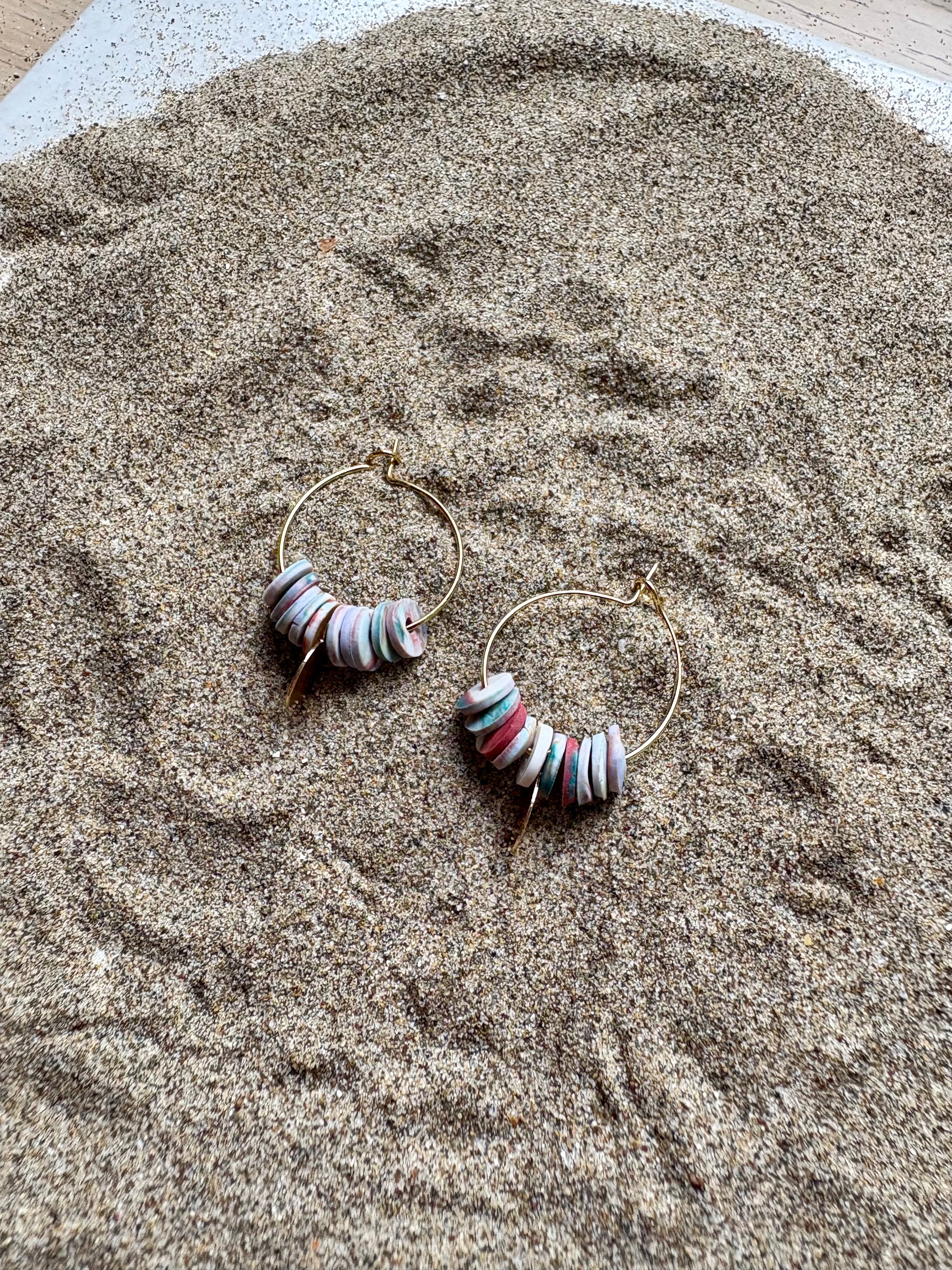 Les perles d'inspiration Heishi qui ornent ces créoles sont réalisées à la main en argile polymère.