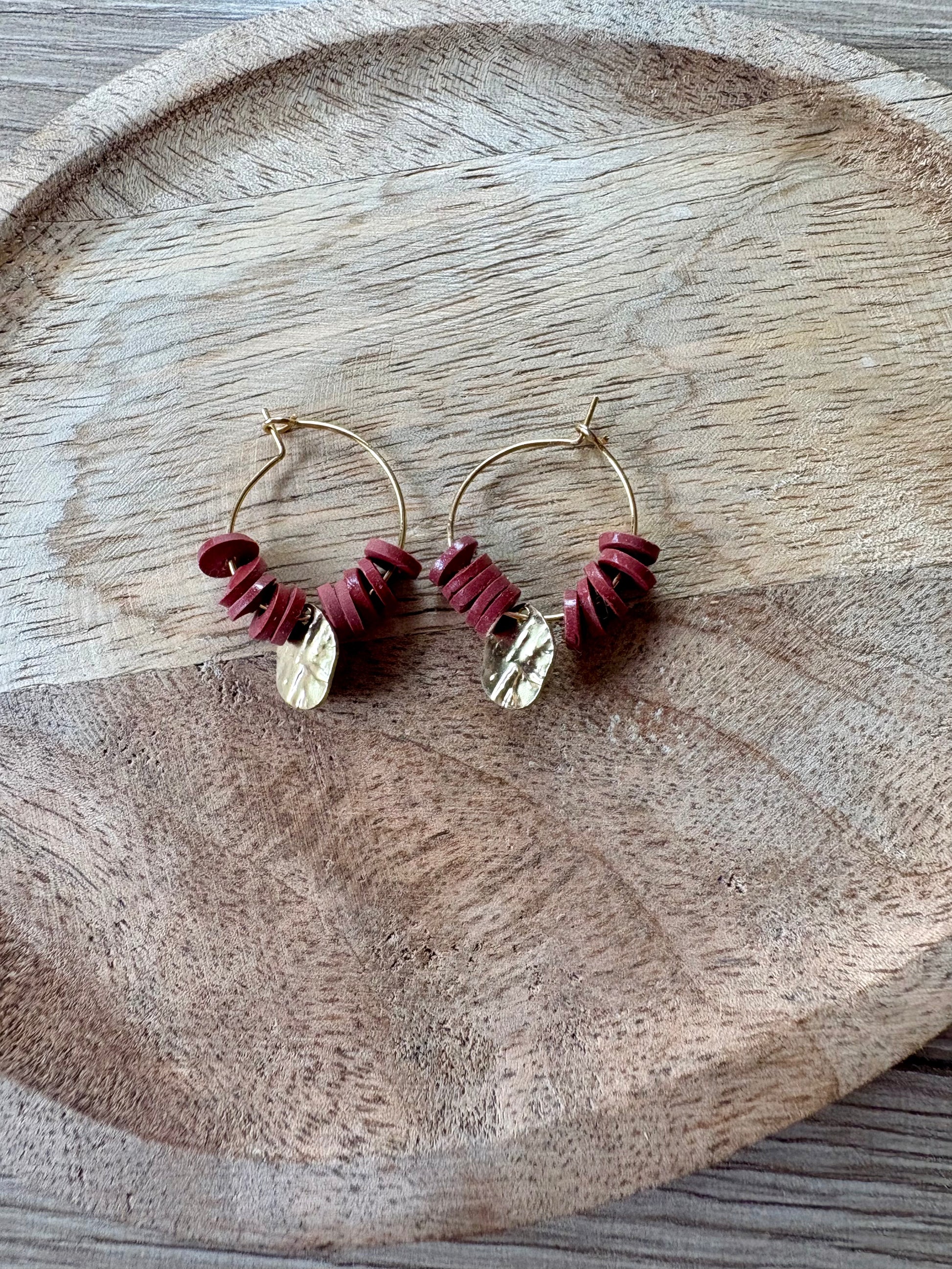 Les perles d'inspiration heishi qui ornent la créole sont réalisées à la main en argile polymère.