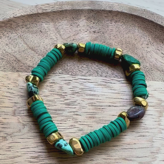 Les perles qui le composent sont d'inspiration heishi réalisées à la main en argile polymère et en véritable turquoise africaine et hématite.
