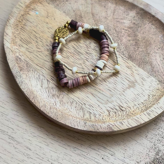 Les perles d'inspiration heishi et petites perles navrées sont réalisées à la main en argile polymère.