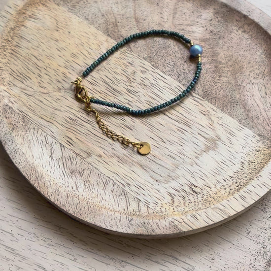 La perle centrale est réalisée à la main en argile polymère, accompagnée de petites perles Miyuki.