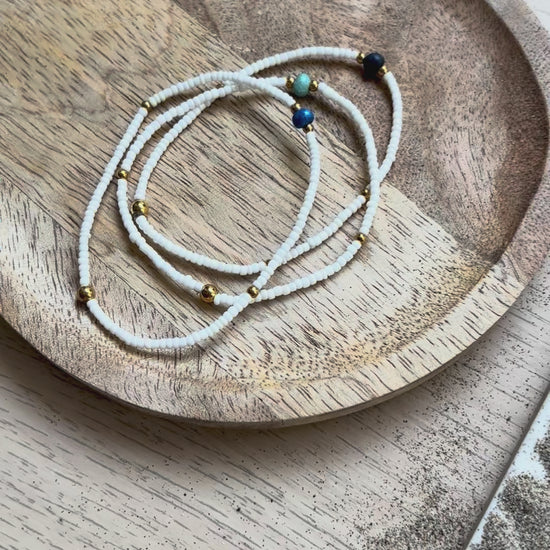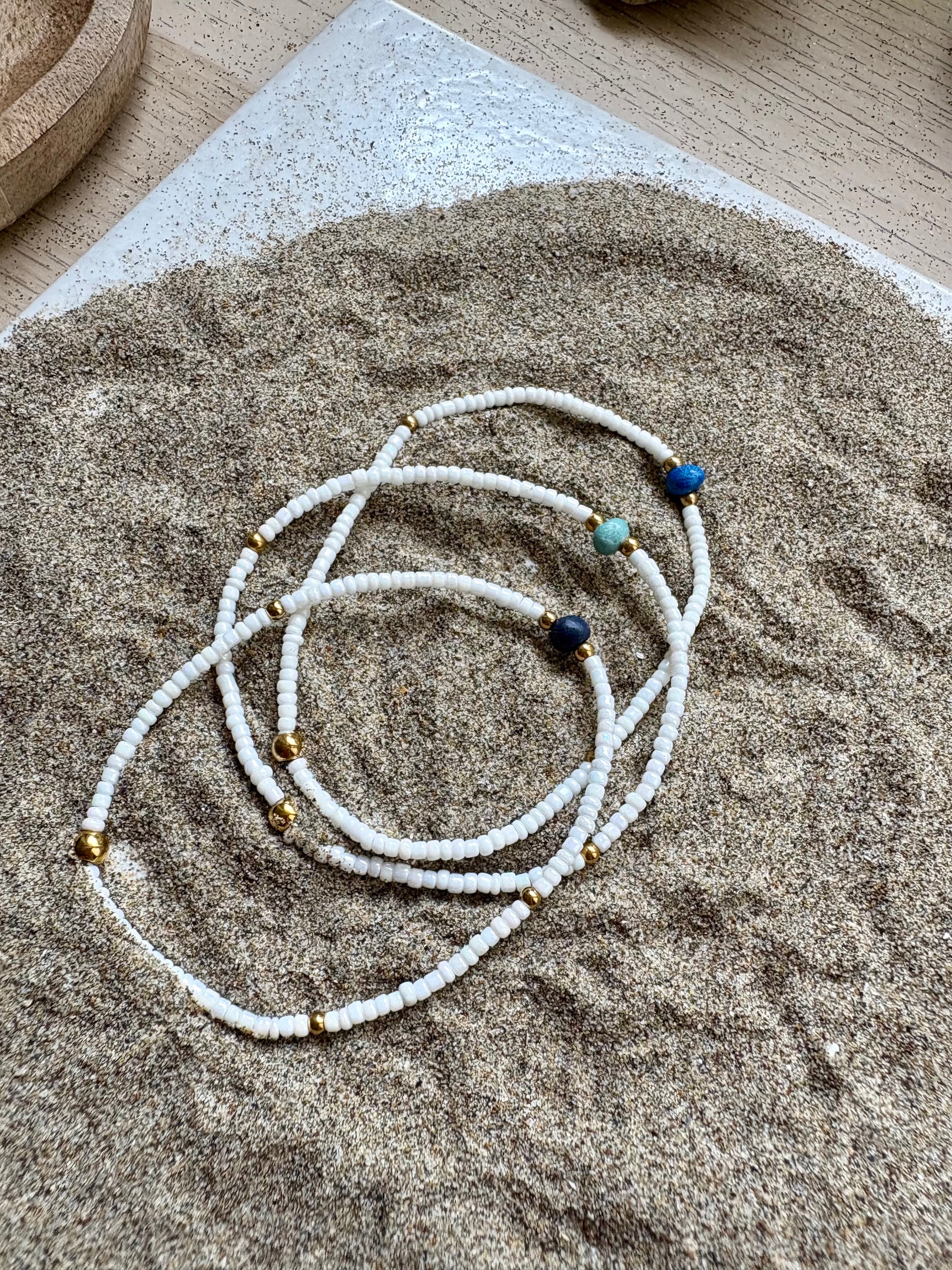 Alba – Trois bracelets aux tons blancs et bleus, doux comme une brise du matin glissant sur l’eau claire.