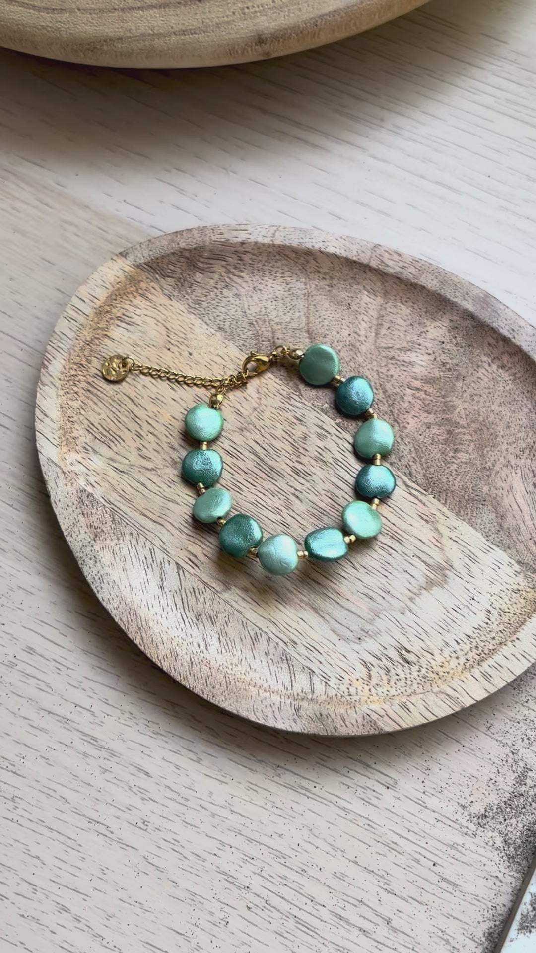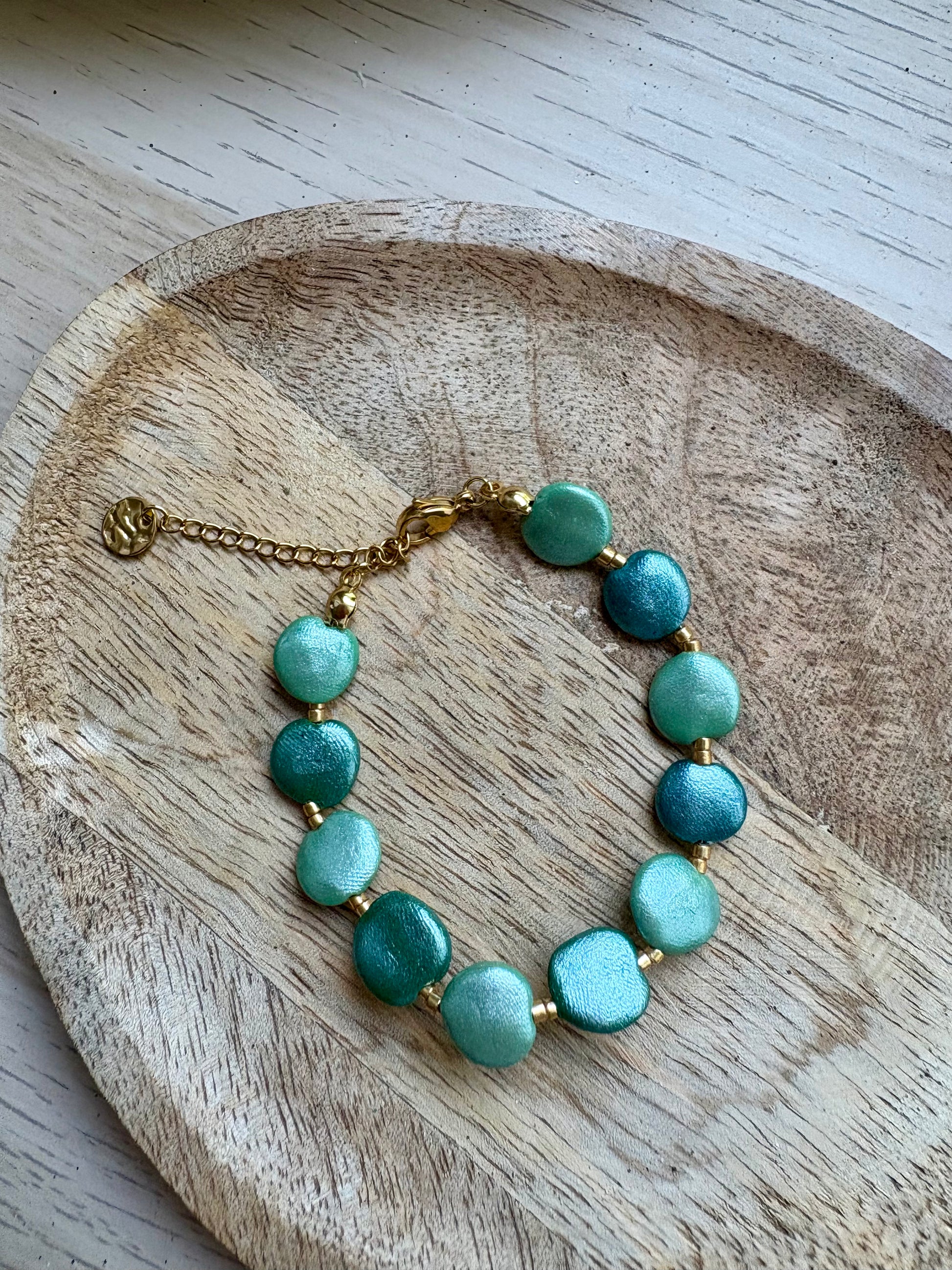 Les perles plates irisées sont réalisées à la main en argile polymère.