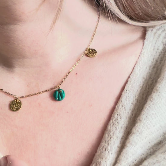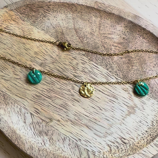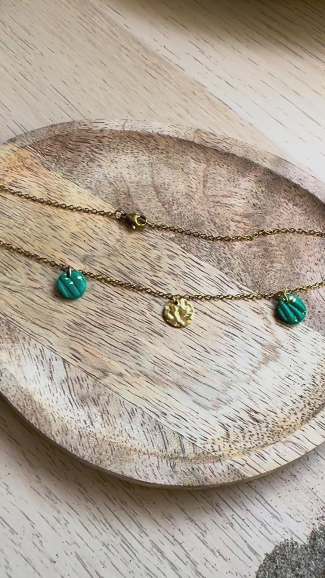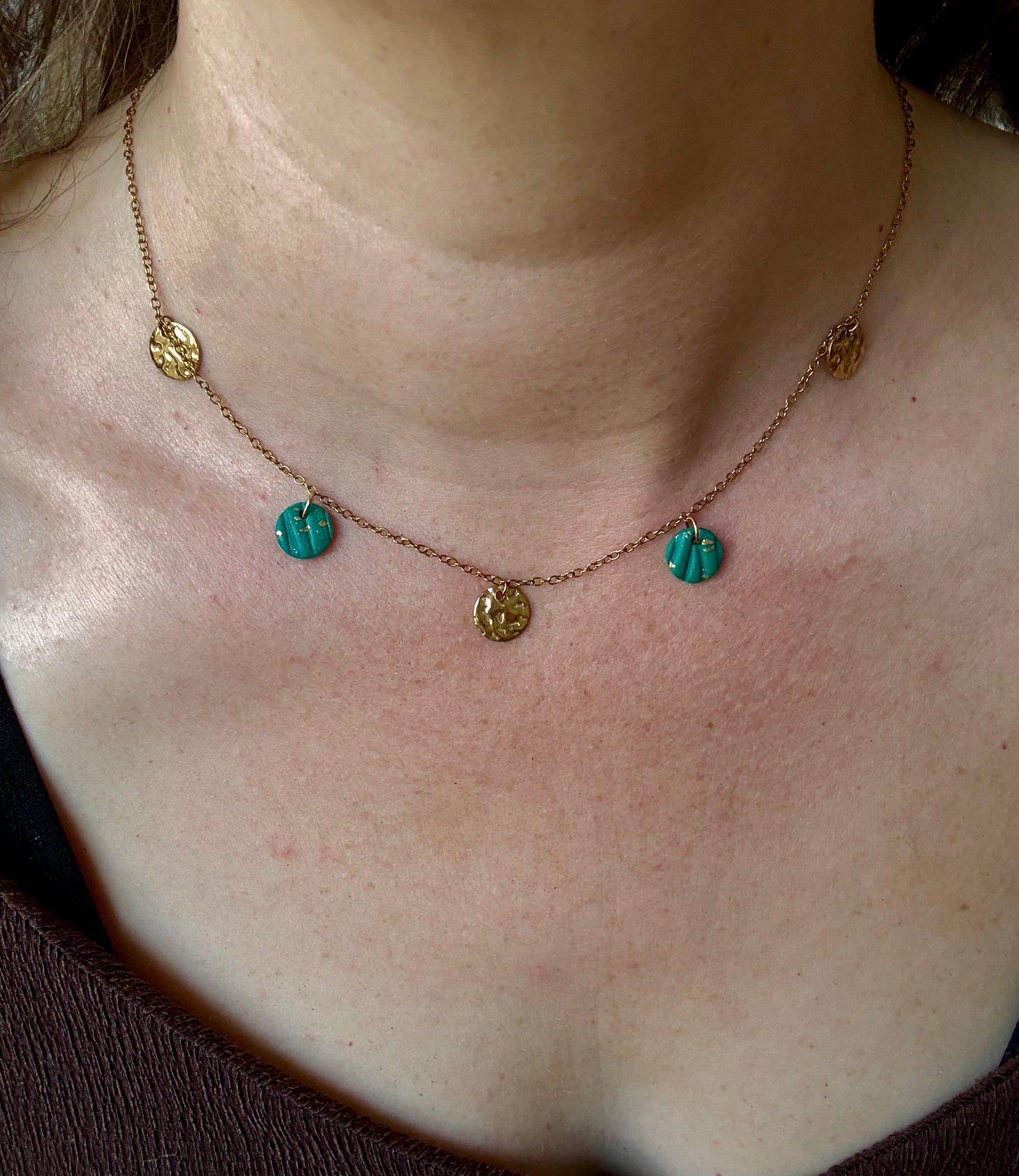 Chaque médaillon capte la lumière comme un fragment de ciel ou de mer, porté au creux du cou. Un bijou à la fois précieux et libre, comme un talisman d’été.